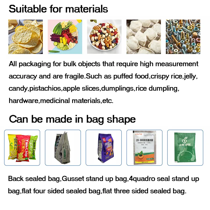 Vertikale Verpackungsmaschinen können Pulver, Granulat, Snacks, Getreide, Hardwareteile und kleine Industriekomponenten verpacken.